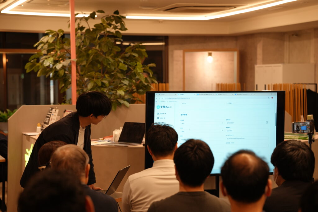 イベントでは、実際のデモ環境を用いた「AI支援さん」の体験会を実施しました。実際の担当者会議を想定した面談音声を使い、録音から文字起こし、専門的な要約、そして公的書類の生成までを一瞬で行う様子をリアルタイムでご覧いただきました。