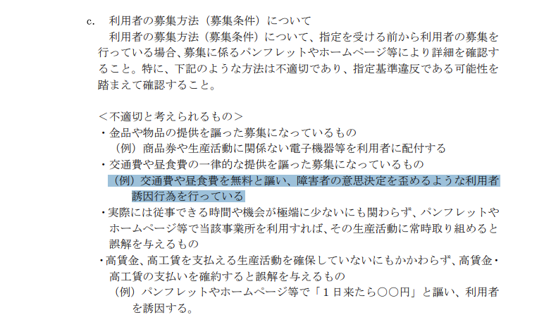 世田谷区の答弁では、「就労支援事業所への利用者交通費を含む運営費補助」について、法人の営利・非営利(株式会社か否か)によって対象を区別しているとの言及がありました。 しかし、厚生労働省のガイドラインでは、就労継続支援B型が利用者に交通費を無料で提供し利用者を誘引する行為は「不適切(指定基準違反の可能性)」と明示されています。