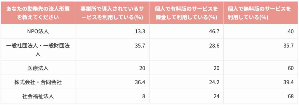 法人格別にデータを比較すると、社会福祉法人が最も顕著に個人での無断のAI利用が見られることがわかりました。