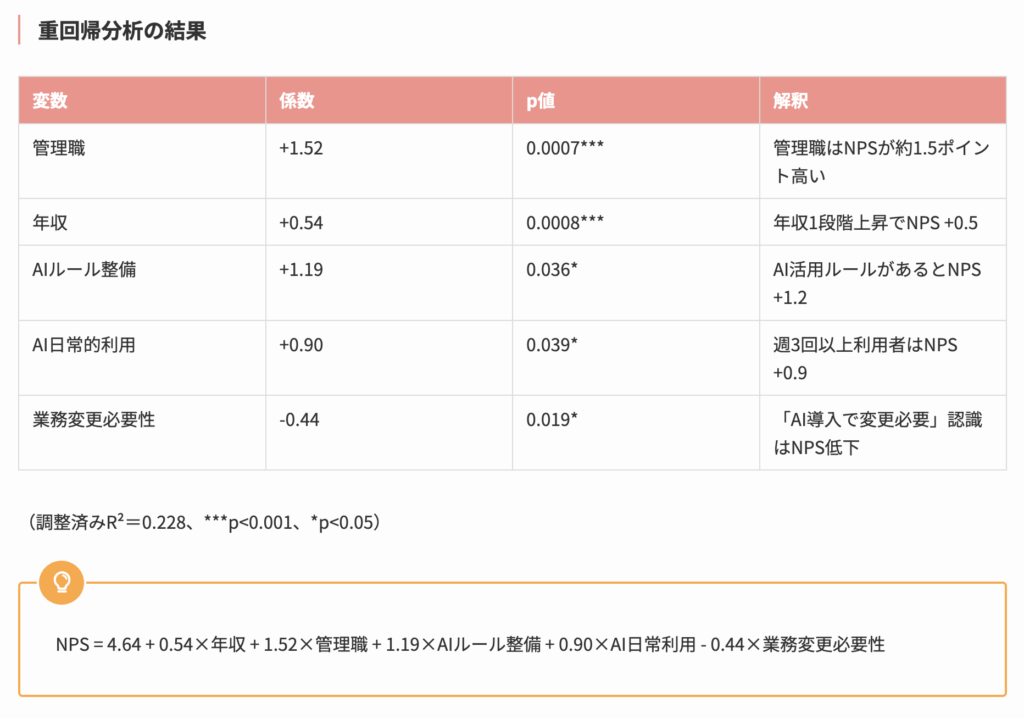 NPS(Net Promoter Score:職場を知人に勧めたいかを0〜10点で評価)を従属変数とした重回帰分析を実施した結果、AI活用ルールの整備が従業員満足度に与える影響は年収アップの約2.2倍であることが判明しました。
